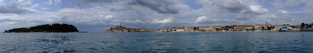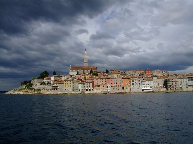 Het weer bijft rustig dus varen we gewoon door volgens plan naar Rovinj. Om 14:00 varen we de haven binnen. De aanloop van de havenkom ziet er fantastisch uit. Het schiereiland met de oude stadskern ligt net in de zon met donkere wolken er boven. Dit geeft een mooi plaatje. We kunnen hier helaas niet goed voor anker liggen dus wordt het weer de marina haven. Op zich geen straf met dit uitzicht: