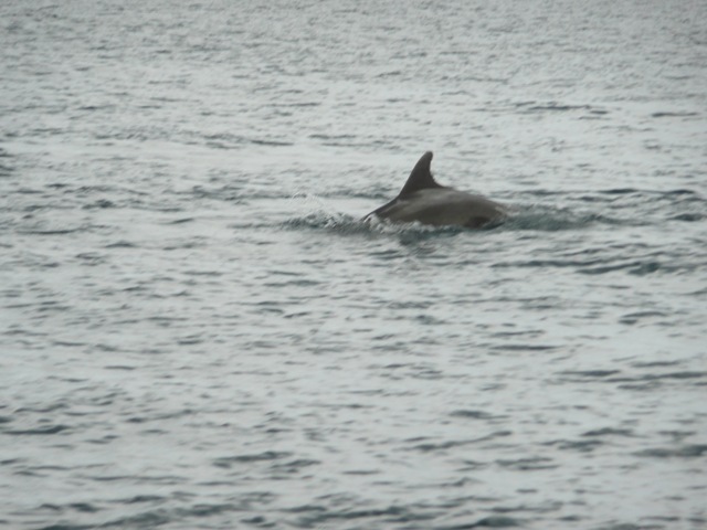 toch echt dat ik iets in het water zag. Yes. een school dolfijnen van ca. 20 stuks. Ik had ze al eens eerder gezien tijdens een tocht met Roy Heiner op een VO60 bij Gibraltor, maar Hilda nog niet. We varen er midden doorheen. Gaaf. Helaas zwemmen ze niet met ons mee. Zo snel ze kwamen, zo snel waren ze dan ook weer weg. We zullen er vast nog wel meer tegenkomen.