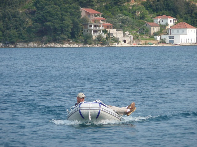Het weer is inmiddels een stuk beter geworden. Toen we vanochtend vertrokken was het nog helemaal bewolk en inmiddels is de zon er flink door gekomen. We liggen in een mooi baaitje, dus het bijbootje komt ook uit de voorpunt vandaag en blazen we op. Tijd voor een tochtje door de baai.