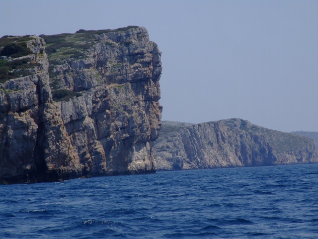 DSCF3798 Vandaag gaan we naar de Kornati eilanden. Tevens een nationaal park. We slakkeren een beetje tussen de eilanden door naar Lavsa. We varen ook even buitenom. Over open zee. Dit ziet er heel anders uit. De binneneilanden zijn glooiend en lopen schuin het water in. Aan de open zee zijn het allemaal ruige hoge rotskliffen.
