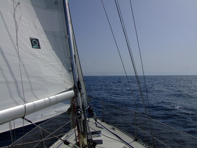 Met dit tempo zouden we al om ca.18:00 de haven van Vieste (I) binnen lopen. Terwijl we er vanuit gingen dat het pas na zonsondergang zou worden. De wind neemt in de loop van de dag nog iets toe tot gemiddeld 15 knopen. Er heeft even 18 knopen gestaan, maar die nam na een half uurtje weer af. Een prima windje voor de oversteek.