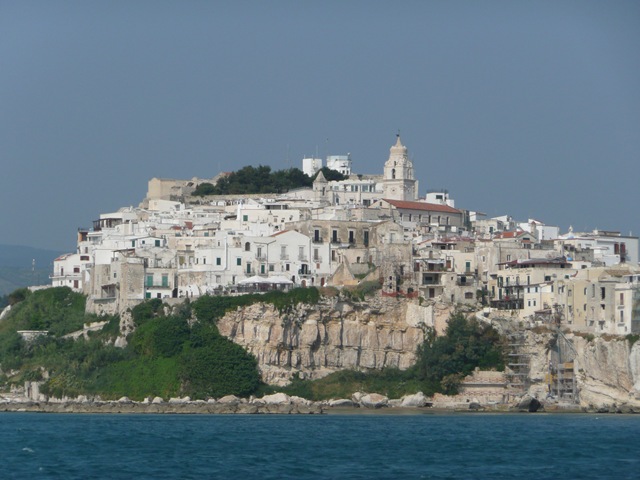 Eenmaal buiten de haven staat er nog steeds ca. 20 knp. wind en redelijke golven/deining. Vieste ligt echter op de punt van een landtong, dus als we om de hoek zijn verwachten we dat het een stuk rustiger is…en dat was ook zo. We hebben nog een mooi uitzicht op de oude stadkern van Vieste.