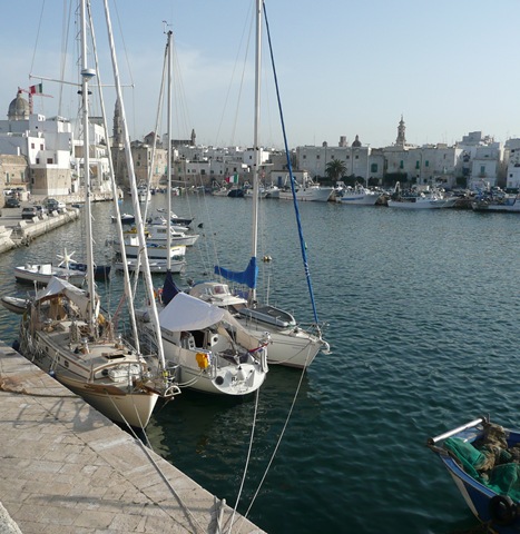 Vandaag staat er een relatief korte tocht in de planning. Het is ca. 23 nm naar Monopoli. We konden vanochtend ook weer lekker zeilen en zijn al om 14:00 op de plaats van bestemming. Althans…in de haven. Nu nog een plekje zoeken. Dat schijnt hier lastig te zijn. Er is inderdaad zo 1-2-3 niets te vinden. We kunnen alleen langzij een andere zeilboot liggen. Het zijn Engelsen. Ze zijn gelukkig aan boord en we vragen vriendelijk of ze bezwaar hebben dat we tegen hun boot gaan liggen. Ze vinden het prima en helpen ons met het vastleggen van de lijnen. Ze maken direct een praatje en vertelden dat ze ook in Bari geweest waren en dat hun bb-motor daar gestolen was. Ons was gelukkig niets overkomen. Ze vertellen ons ook waar we hier in monopoli e.e.a. kunnen vinden, zoals een groente en fruitmarktje en een supermarkt. Dat komt goed uit want we moeten nog inkopen doen.