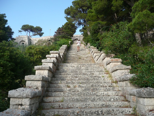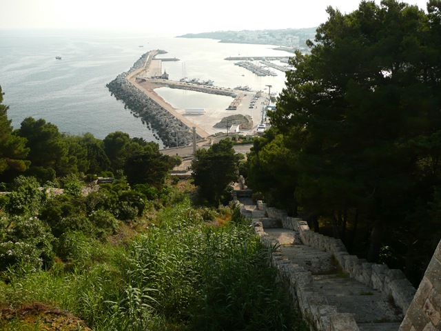 Eenmaal aangekomen gaan we op zoek naar een paar fenders. De nieuwe die we in Nederland gekocht hebben, blijken niet van zo’’n goede kwaliteit te zijn. In een winkeltje vinden we 2 fenders die zouden voldoen, alleen ze zijn helemaal vies. De taalbarriere lijkt ineens groot. We zien af van de koop en maken de klim naar de vuurtoren. In opdracht van Mussolini zijn hier trappen gebouwd als “ceremoniële poort naar Italië”. Het is zeker de moeite waard want bovenop de heuvel heb je een mooi uitzicht over de zee.