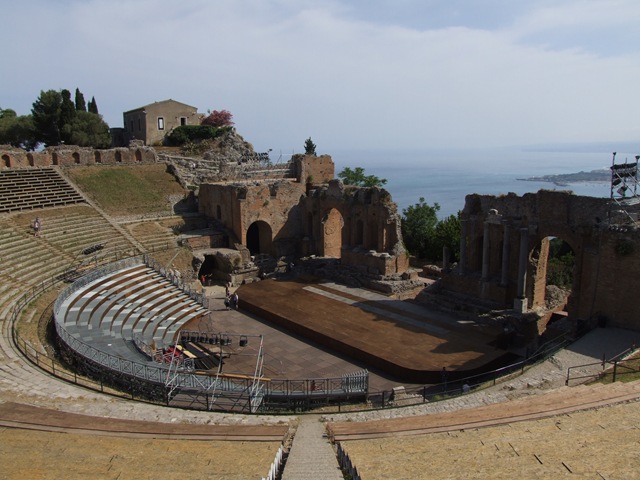 Dit ligt iets noordelijker dan Riposto (waar onze boot ligt). We nemen nu wel de snelweg omdat het anders toch te veel tijd kost. Taormina moet een erg mooi maar toeristisch plaatsje zijn op een berg direct aan zee. Het heeft o.a. nog een oud Grieks theater. Ondanks de vele toeristen moet je hier geweest zijn zegt men. Ik moet inderdaad zeggen dat het erg mooi is.