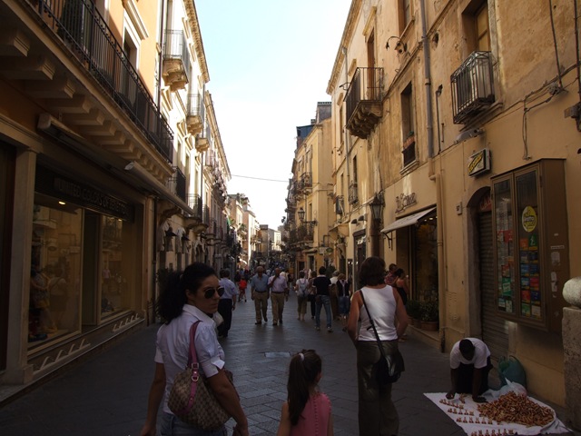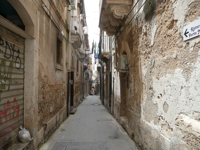 wegen zijn smal en slecht. Daarbij komt dat de Italianen rijden als gekken. Gewoon inhalen bij een doorgetrokken streep terwijl er tegenliggers aan komen is hier heel normaal…die gaan wel aan de kant. Zowel links als rechts kun je ingehaald worden. En je moet erg oppassen als je af wilt draaien of er niet zo’n idioot op een scooter langs komt sjezen. Twee uur later zijn we in Siracusa. George, de Fransman van vorige week zei dat dit een erg leuk plaatsje is met hele smalle wegen met name het schiereiland Ortigia.