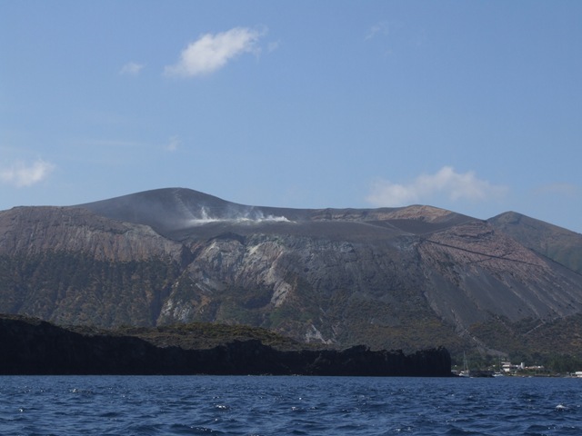 De wind lijkt prima en we hebben alle tijd. Na tochten van 30 mijl of meer is het wel weer lekker om tochtjes van rond de 20 mijl te varen. We gaan tussen de twee eilanden door. De krater van Vulcano is aan deze kant veel beter zichtbaar. We vinden het erg mooi om te zien en dat pluimpje rook maakt het echt echt.