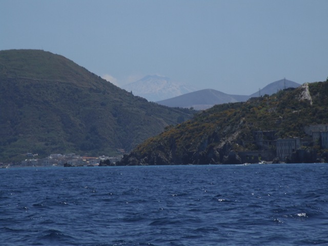 Dit eiland gaan we niet bezoeken, maar het ziet er wel mooi uit. Mooier dan Lipari, vinden wij. Toen we de noordwest hoek van Lipari omgingen konden we de Etna ook weer zien.