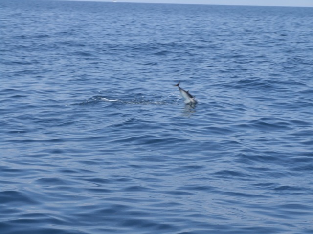 Even later kunnen we zonder moter verder. We varen door een ‘restricted area’. Daar kun je beter niet ankeren en vissen en dergelijke. Blijkbaar wordt er weinig gevist, want het krioelt er van de vissen …”ik zie er wel 100…euhhh…4” (of het is toeval). Ook vissen die net als dolfijnen boven water komen springen. Ze zijn wel een stuk kleiner. Ca. 2 uur lang zien we ze naast onze boot mee zwemmen en regelmatig uit het water springen. Het is een grappig gezicht. Wat voor vissen zijn dit?