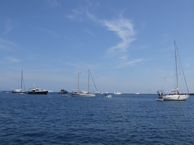 Nu mag je rond Stefano niet ankeren, maar de italianen zelf hebben daar geen boodschap aan. Er liggen allemaal bootjes vlakbij het eiland. Ook voor Ventotene liggen allemaal boten voor anker. Wij varen eerst de haven in. Daar komt een bootje naar ons toe, één nacht is 100 euro. Daar hebben we geen zin en gaan de haven uit om te ankeren. Meerdere boten draaien na ons nog de haven in en uit en doen hetzelfde. Een Duitser weet ons te melden dat hij 4 jaar terug maar 15 euro betaalde. ‘s Avonds ligt de haven toch redelijk vol, genoeg mensen die wel wilen betalen.