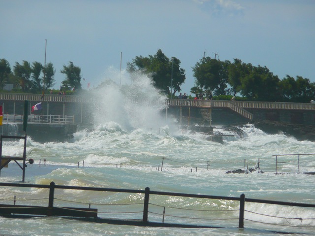 Rond middernacht zet de wind flink aan en gaan we, ondanks dat we erg beschut liggen, toch flink opzij. We worden ‘s nachts een aantal keer wakker en controleren gelijk of we nog goed liggen. De volgende ochtend gaan we na het ontbijt gelijk even naar het strand om te kijken hoe hoog de golven zijn. We zien ondertussen al regelmatig waterspetters meters boven de muur van de haven komen. Deze muur is toch een metertje of 8 hoog. Dat voorspelt niet veel goeds.  Op het strand…of wat er van over is…kunnen we het goed zien.  De branding is zeker 2 – 2,5 m hoog en slaat flink op enkele rotsen voor de kust en een stuk kade. Het water spettert daarbij meters hoog.  Verder op zee staan er nu zeker golven van 4 m. P1010947