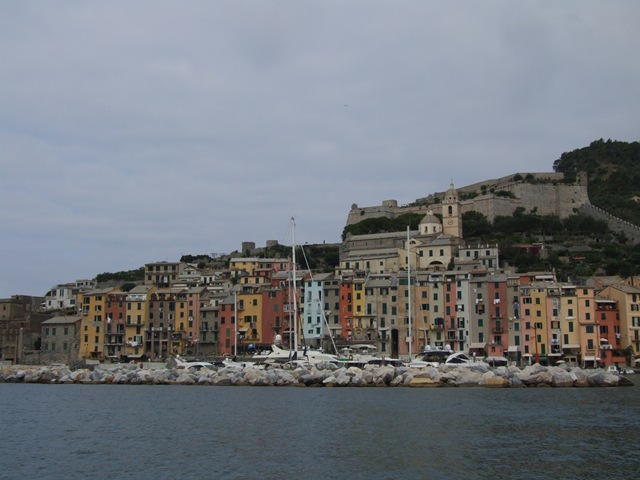 Het is een mooie tocht. Eerst door de baai van Portovenere. Daarna komen we langs een aantal pittoreske dorpjes op hellingen met veel druiven-struiken. Een stuk verder zien we weer eens dolfijnen. We hadden ons net afgevraagd of ze hier wel zaten. Het laatst zagen we ze 300 nm zuidelijker in Salerno een hele tijd terug. En dan komen we in de baai van Marconi (of Tiggulio).