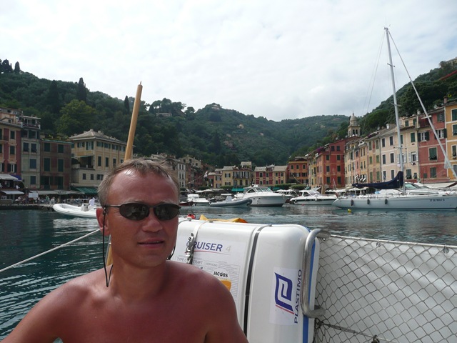 in om even te kijken. Het ziet er erg mooi en vredig uit. Er lijkt wel plaats te zijn, maar we varen toch door. Ankeren doen we uiteindeijk niet. Het is of te diep of te veel last van golven. We belanden in de haven van Rapallo, 3 nm verder in de baai. Een mooie haven, maar de duurste tot nu toe. Op de parkeerplaats staat de derde rode Ferrari, die we tot nu toe tegengekomen zijn.