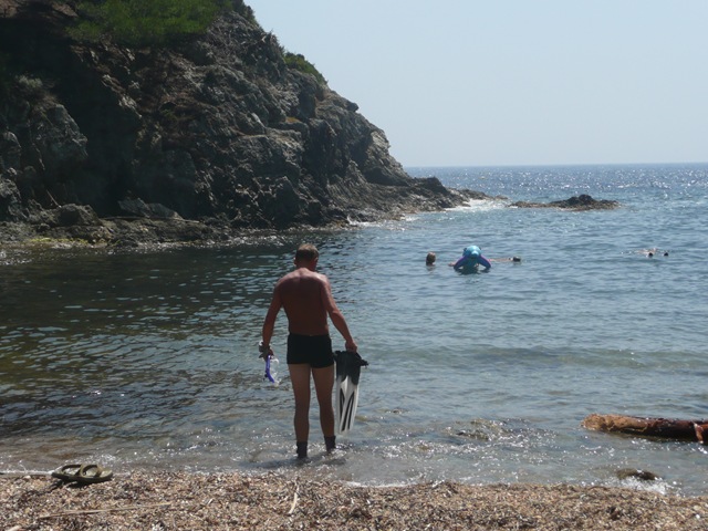 Op Porquerolles lopen we eerst naar een baai aan de noordkant om wat te snorkellen (Sebas). Daarna naar het strand vlakbij de haven met zilverwit zand. Op het strand is het druk met de vele dagjesmensen die naar Porquerolles komen met de ferry.