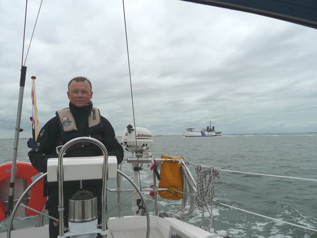 en we houden toch de vaargeul maar aan. Een klein uurtje omvaren, maar wel zo veilig. Langzaam beginnen de golven toch flink toe te nemen. Tot zeker een dikke 2 m. Iets meer dan voorspeld. Dit komt echter door de ondieptes bij de Waddeneilanden. Eenmaal op volle zee valt het reuze mee, een metertje, en we varen in een ruk door naar Brunsbuttel (i.p.v. Cuxhaven).