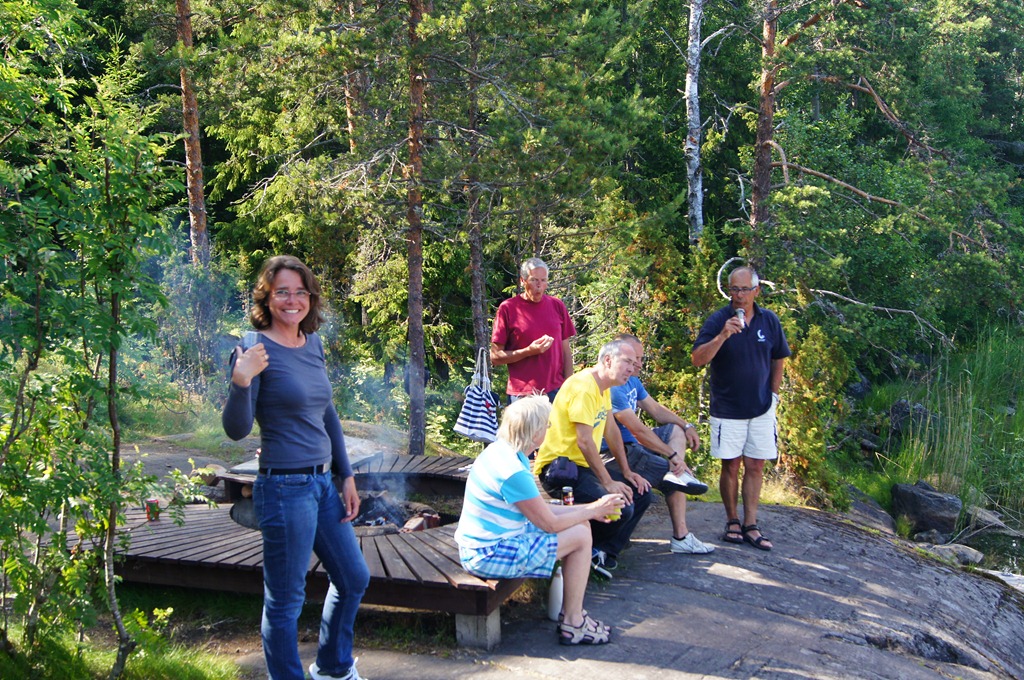 De Goelyo verandert zijn routeplan en vaart met ons naar Bockhamn. We hoeven nog maar iets meer dan drie mijl. Daar aangekomen zien we de Wandelaar en de Anne-Gre liggen. We passen er nog net bij aan de steiger. Dan blijkt dat Jules van Goelyo jarig is. We hebben een klein feestje op de rots bij de steiger. Sebas mag weer vuurtje stoken en de Anne-Gre bakt brownies. De enige Finse boot aan de steiger drinkt een borrel mee. De Fin is al 85 en zeilt nog. Toch knap.