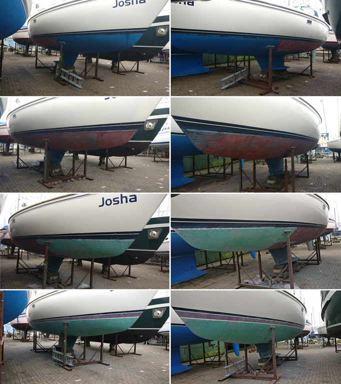 Het grootste deel van de antifouling was wel af, maar er moet nog een laag af die er afgeschuurd moet worden. De relatief eenvoudige klus bleek uiteindelijk toch nog een klus van 3 dagen te zijn….maar dan heb je ook wat…..en keurig kaal onderwaterschip tot op de onderliggende Gelshield. De rest van de winter later we het onderwaterschip nog drogen en als de temperaturen in het voorjaar weer richting de 15+ gaat, gaan we het verfsysteen weer opbouwen. Het plan is om eerst 2/3 nieuwe extra lagen Gelshield 200 aan te brengen om het onderwaterschip (excl. kiel) weer af te sluiten en goede basis te vormen voor de nieuwe antifouling. De kiel hoeft niet in de Gelshield maar krijgt wel eerst nog een nieuwe laag Primocom