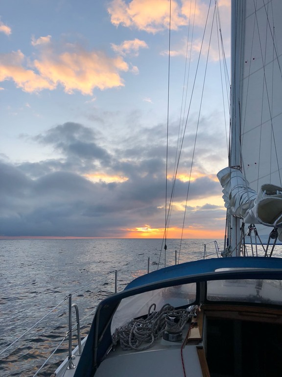 De nacht verloopt verder redelijk voorspoedig en rond 4:30 zien we de eerste schemering opkomen. Altijd een heerlijk gevoel op zee als de nacht zich overgeeft aan de dag. De wind neemt steeds verder af. Rond 15:00, ca. 1 uur voor op planning, varen we bij de ingang van de Elbe. Dan is het nog 25 mijl varen tot Cuxhaven. Hilda en Mieke zijn dan inmiddels in Cuxhaven en is het wachten todat wij de haven binnen varen. De stroom werkt echter nog echt mee en hebben het hele stuk de stroom tegen. Pas rond 19:00 begint hij langzaam mee te lopen. Blij en voldaan varen we om 19:35 varen de haven van Cuxhaven binnen. 22 uur na ons vertrek uit lauweroog.